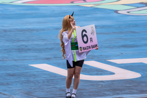 選手紹介後、選手達が観客へプレゼントの記念品を投げ入れる