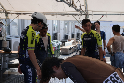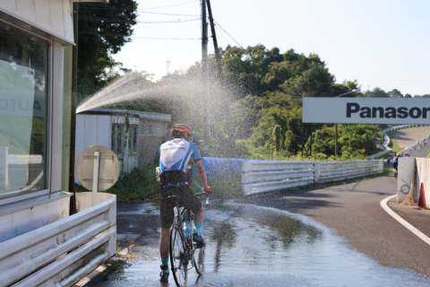 シャワーゾーンでレース後の火照った身体を冷やす参加者の皆さん