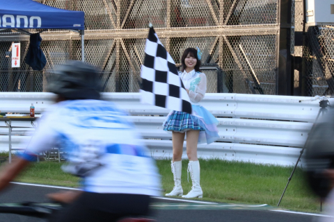 SKE48の荒野姫楓さんがチェッカーフラッグを振り、参加者にエールを送った
