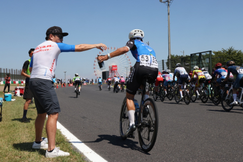 補給所では多くの選手がスポーツドリンクや水を受け取っていた