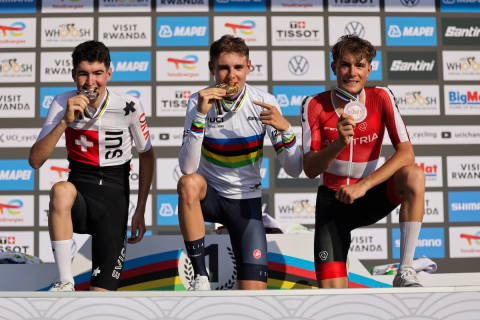 ロード世界選手権2025男子U23ロードレース表彰台:2位フーバー、1位フィン、3位シュレットル