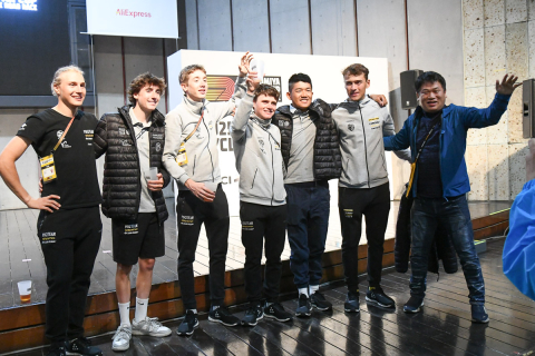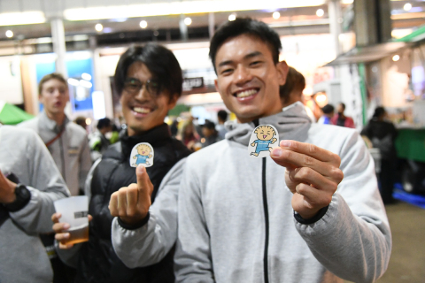 シマノレーシング仕様の「餃子たん」を手にする山田拓海と香山飛龍