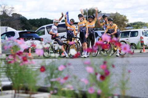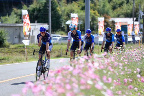 コスモス咲くなかを走り抜けるイスラエル・プレミアテック
