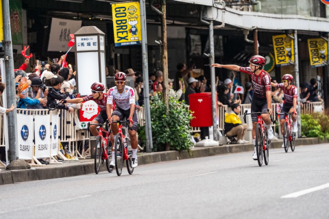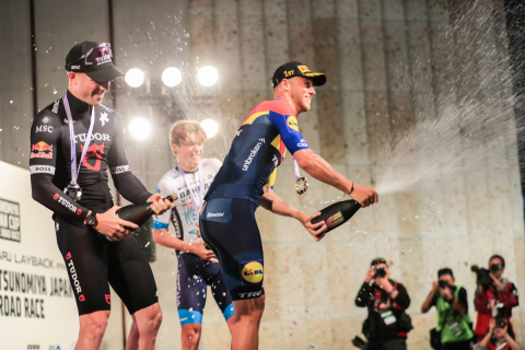 クリテリウム表彰式 優勝はジョナタン・ミラン(イタリア、リドル・トレック)、2位ミカ・ヘミング(ドイツ、チューダープロサイクリング)、3位フラット・ファンミヘレン(ベルギー、バーレーン・ヴィクトリアス)