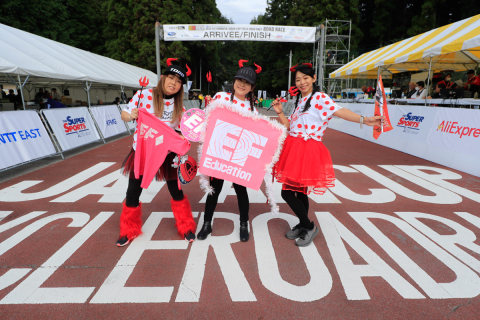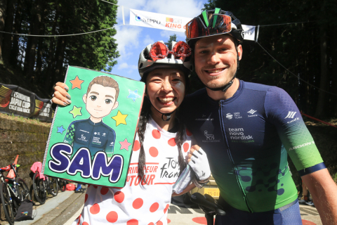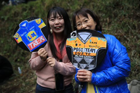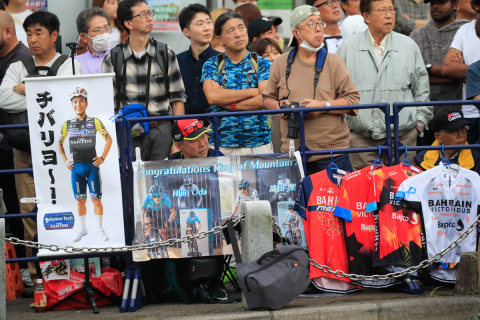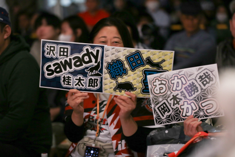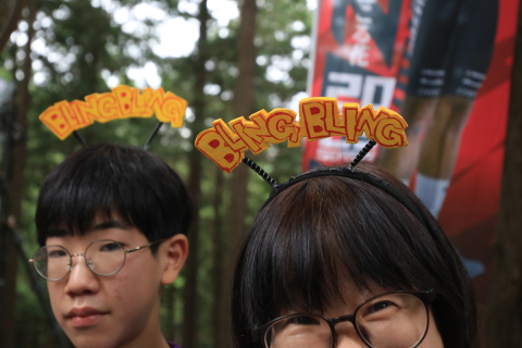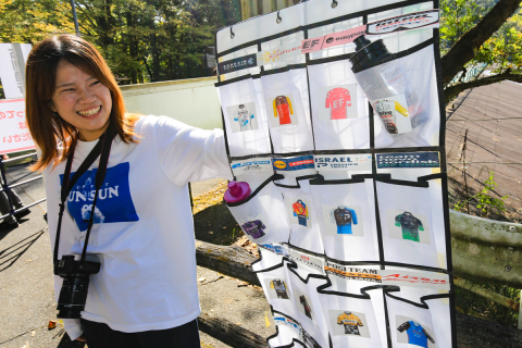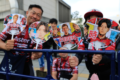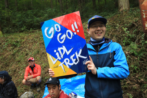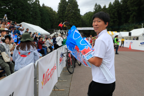 ポギチームとリドル・トレックのジャージのうちわで応援