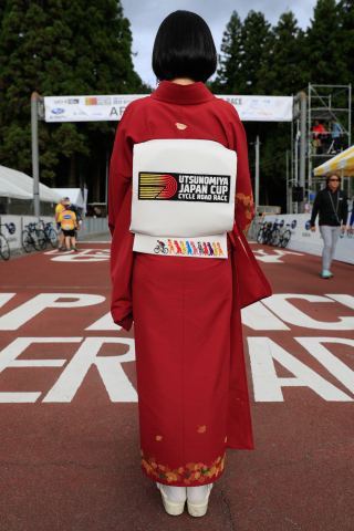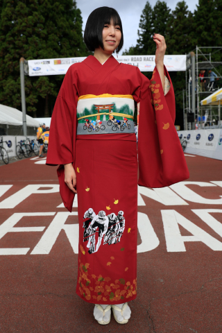 毎年見事な刺繍入りの和服を披露してくれる小夜さん。帯はクリテリウムの二荒山神社前だ