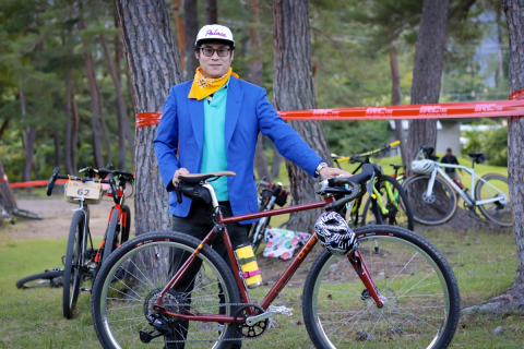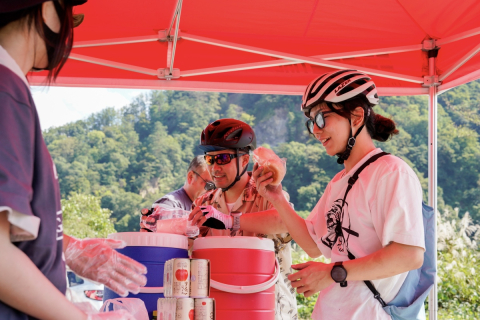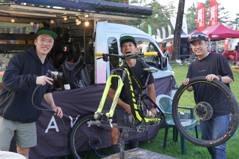 キャンプ泊で参加していたサイクルハウスミカミの三上和志店長。一緒に走ったお客さん(左)は「無事に走り切れました!」と喜びを爆発させていた