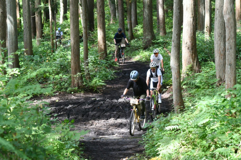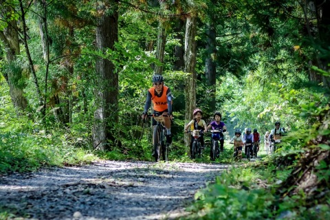 オフロードの走り方を教えながら、スタッフがキッズグループを先導する