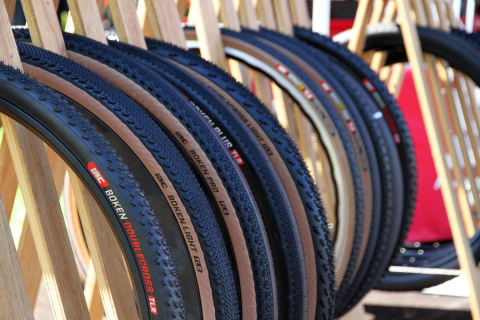 iRCのグラベルタイヤ、BOKENシリーズが並ぶ