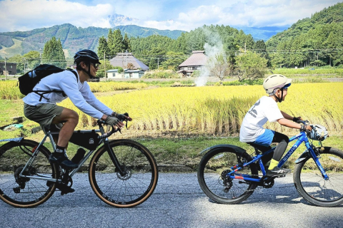 まるで日本昔ばなしの風景を行く親子サイクリスト