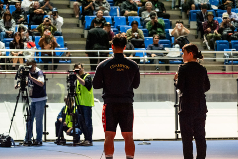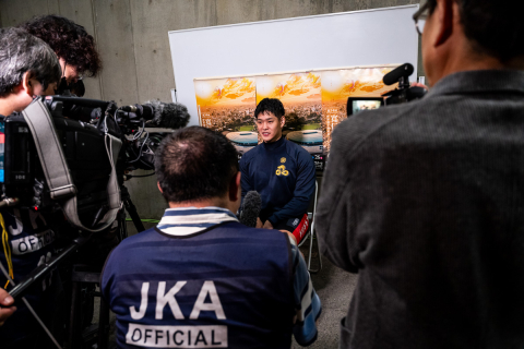 表彰式を前に、優勝者インタビューを受ける嘉永泰斗(熊本)