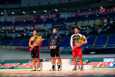 表彰台の下に1〜3着の3名が並ぶ