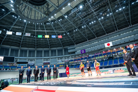 降納された国旗とともにトップ3がフォトセッションを行う