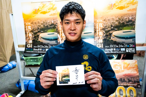 サインしたQUOカードを手に、写真に収まって下さった嘉永泰斗選手(熊本)
