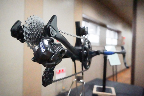 最新世代のSUPER RECORD 13のコントロールレバーで12sディレイラーを動かせる展示