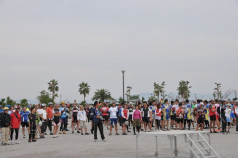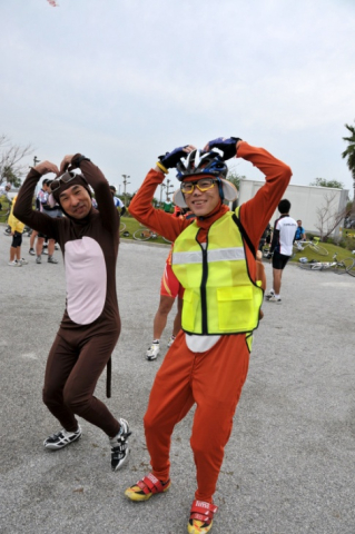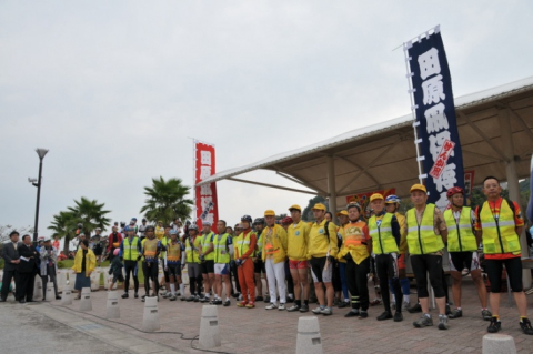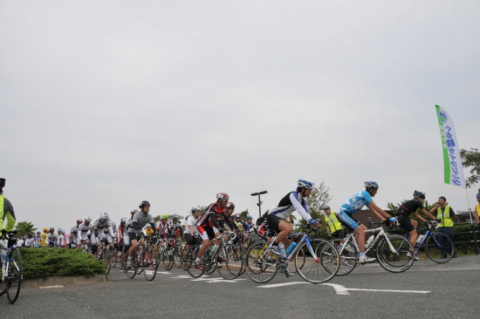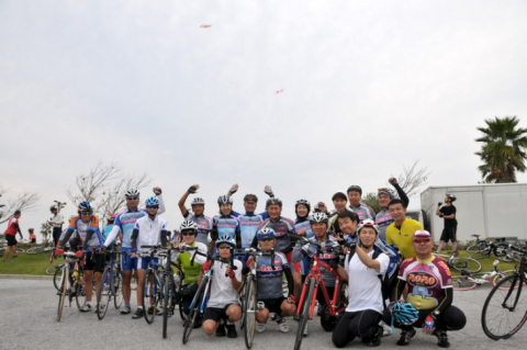 スタート地点にて。愛三サポーターズクラブ、CyclingTeamIgnitionを始めとした仲間たち。頭上には凧があがっています