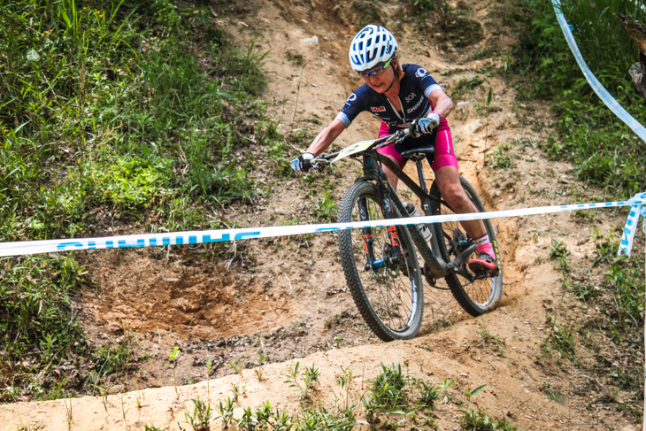 上位陣の多くが降車を強いられた猪落としを乗車のままクリアする小林可奈子(MTBクラブ安曇野)