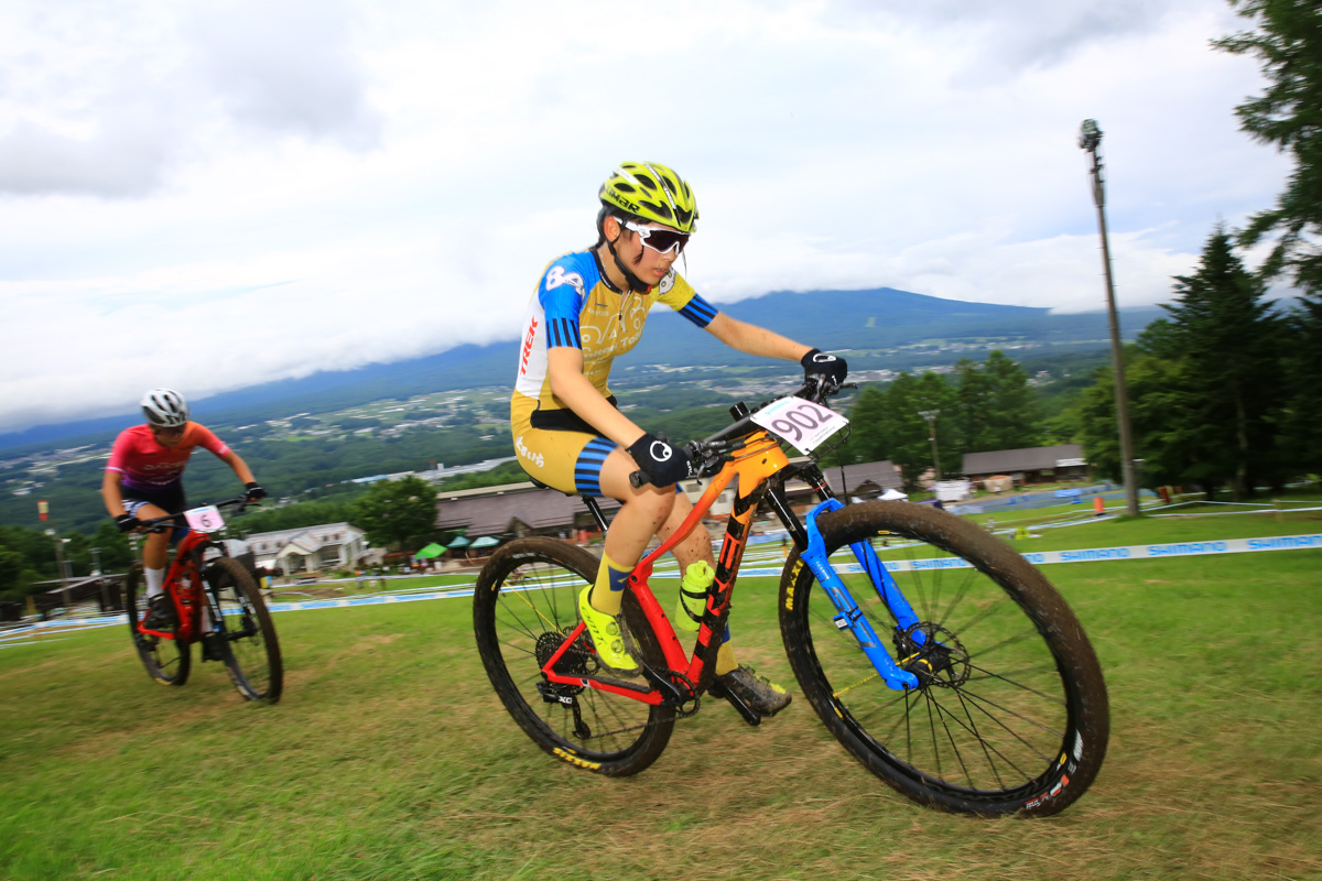 川口うらら(TEAM TATSUNO)にアタックを仕掛ける日吉彩華(LimitedTeam846まるいち)
