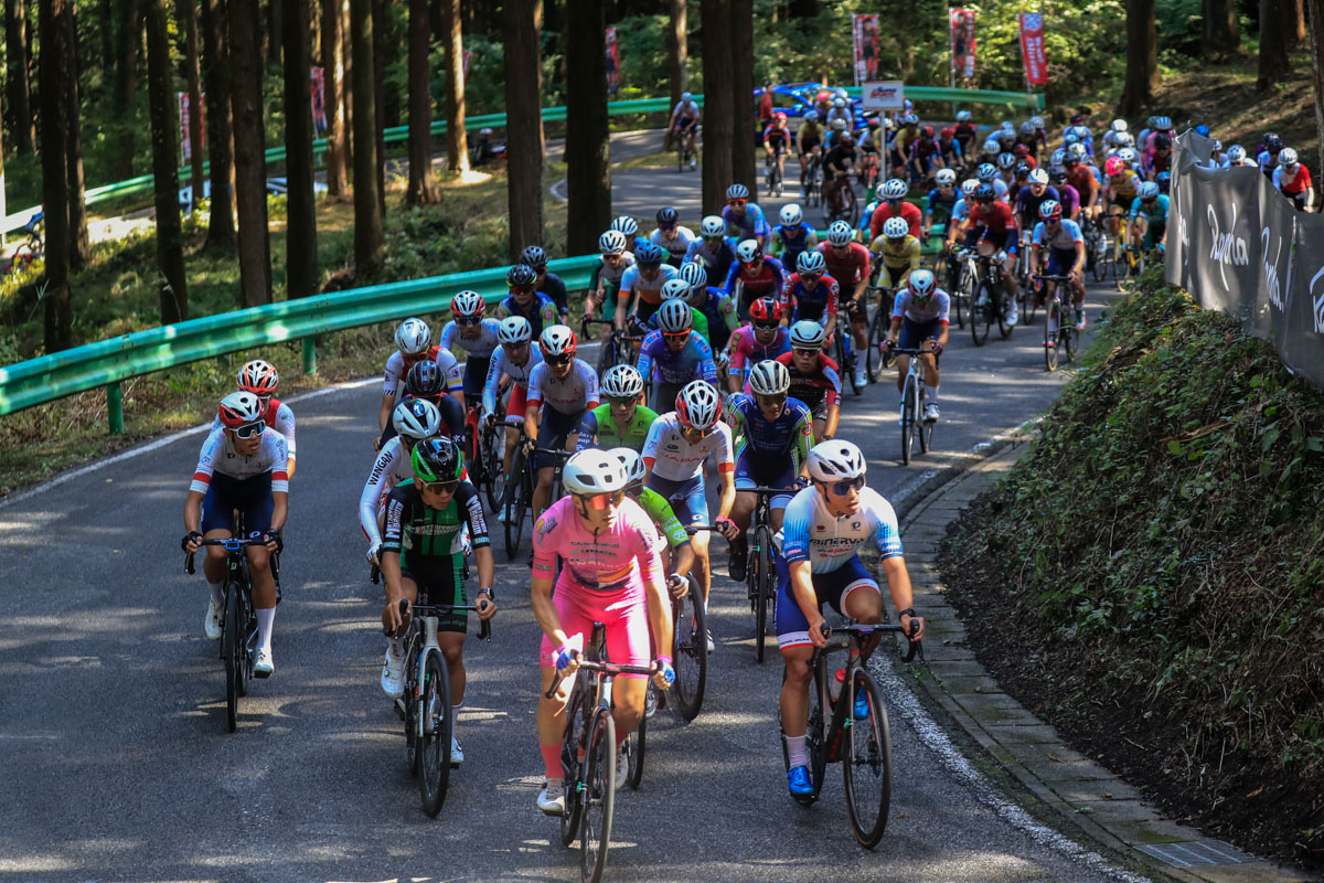 古賀志林道を登るオープンレース男子のメイン集団