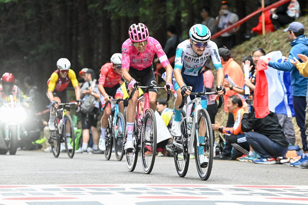 残り2周、レニー・マルティネス(フランス、バーレーン・ヴィクトリアス)が古賀志林道の登りでペースを上げる