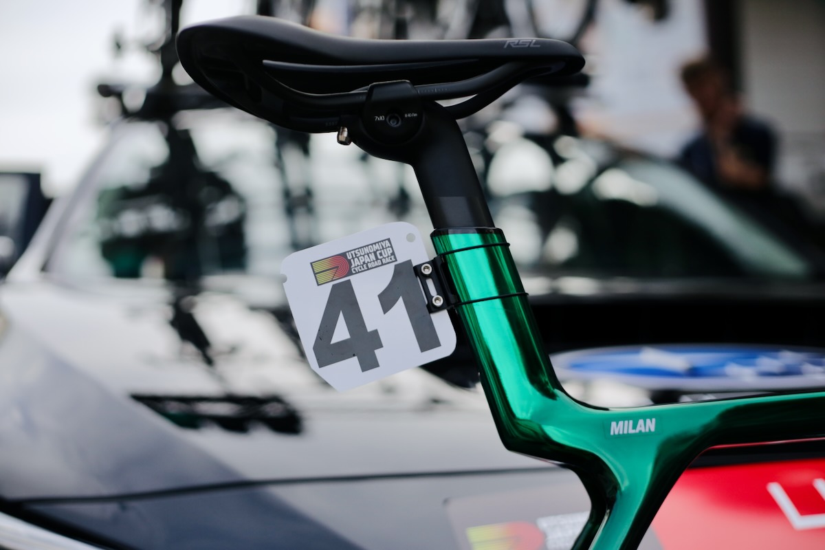 本来のチームバイクはゼッケンホルダーを接着で取り付けている。今回用意されたバイクはゴムバンド固定式