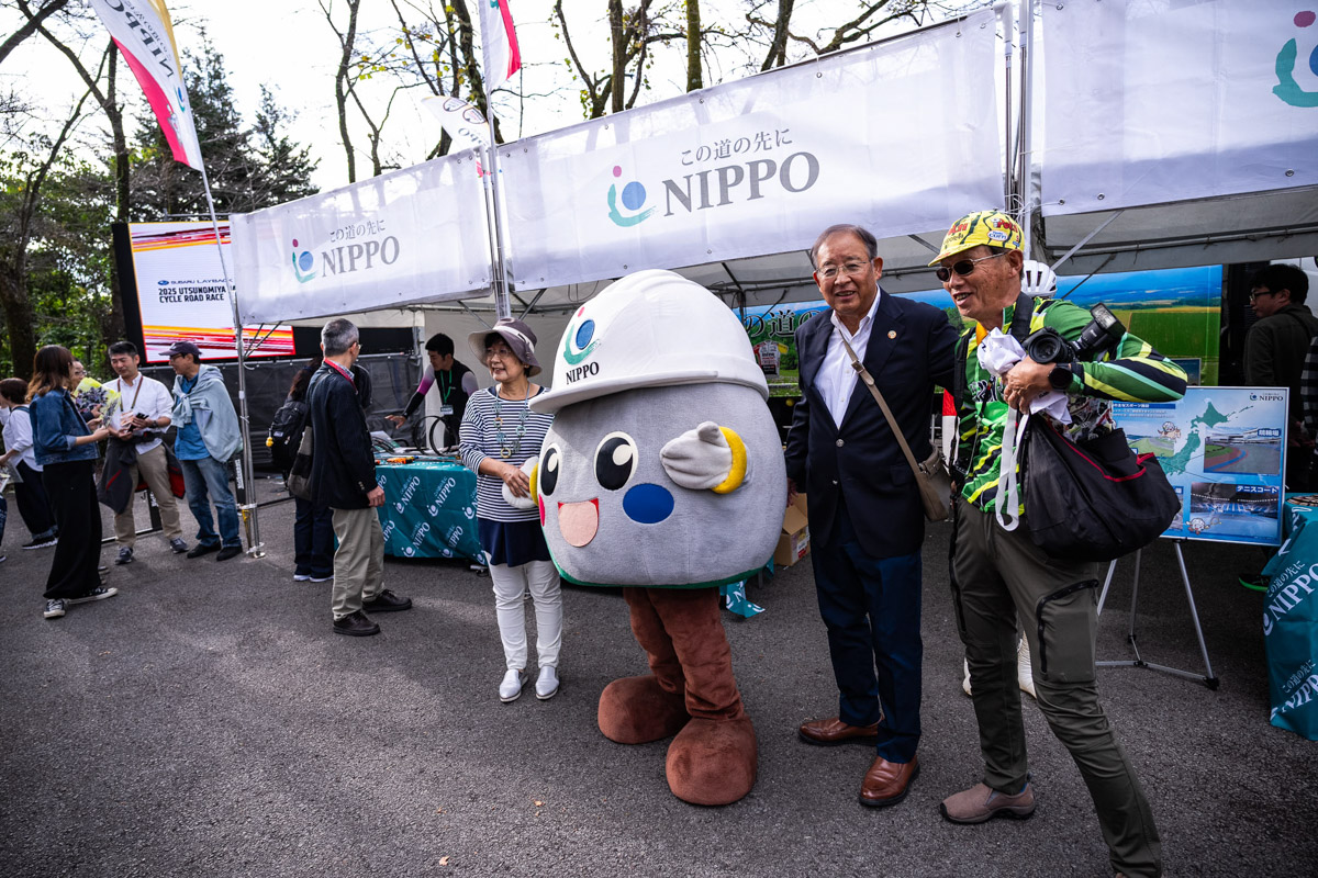 NIPPOのミッチー君と懐かしの日本舗道ジャージを着た高橋秀明カメラマン