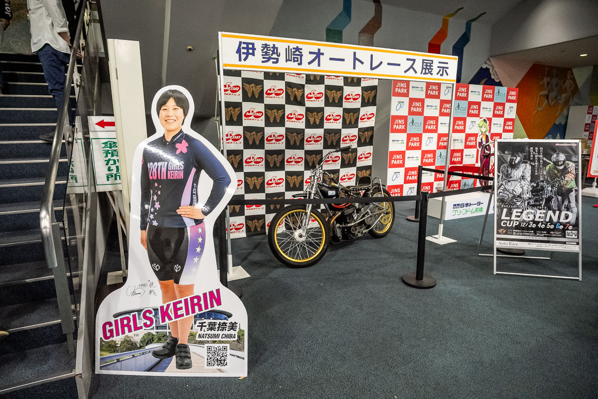 伊勢崎オートレースのバイクの展示などもあった。手前のパネルはガールズケイリンで群馬所属の千葉捺美選手