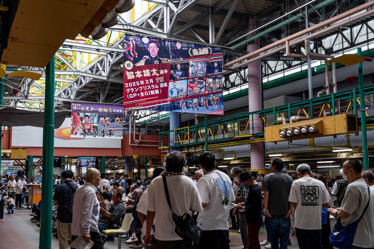 地元・福井の脇本雄太選手のグランプリスラム達成や寺崎浩平選手のオールスター競輪優勝を祝うタペストリーが下がる中央コンコース photo: Yuichiro Hosoda