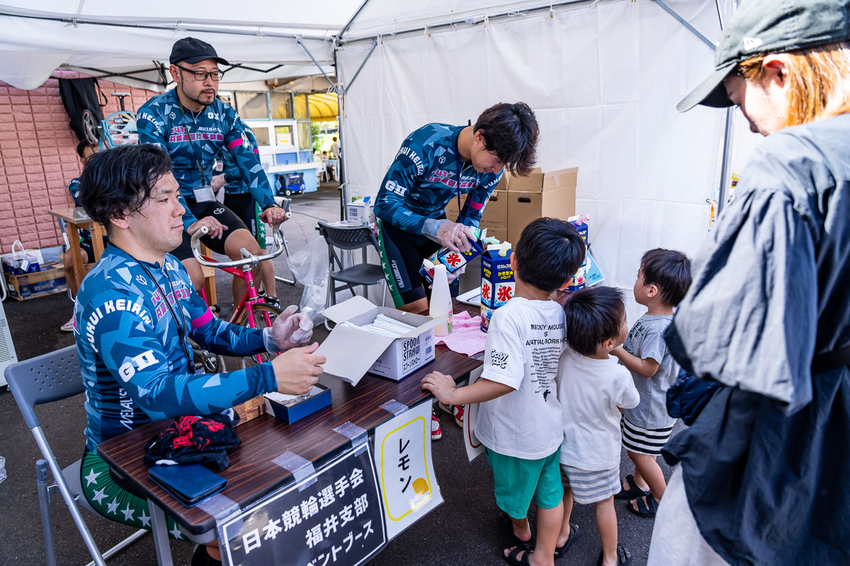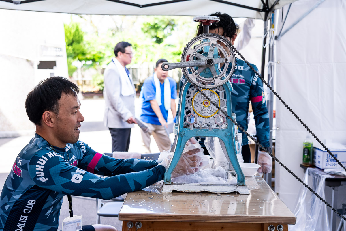 恐竜以外も抜かりがない。いまだ30度を超える気候に、競輪場ではおなじみのチャリ氷が控える。競輪選手会福井支部の皆さんが、涼を提供していた。このかき氷システムについては「自分が来る以前からあるので、どなたが作ったのかわからなくて。壊れたら直せない気がします…」と福井支部長の鷲田幸司選手。でも、自転車メンテナンスの知識豊富な競輪選手やビルダーさんが協力したら、きっと直せます!