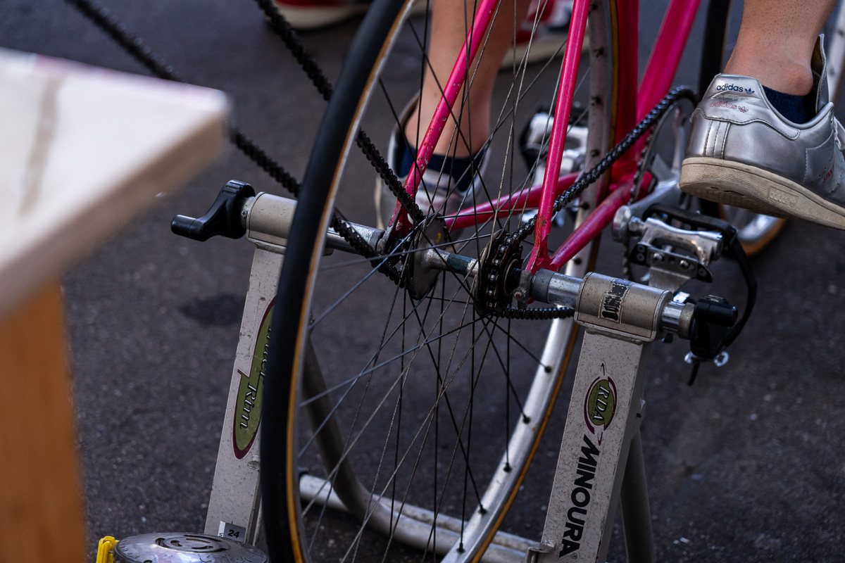 両切りのリアハブが仲介して、かき氷機に動力を伝えている photo: Yuichiro Hosoda