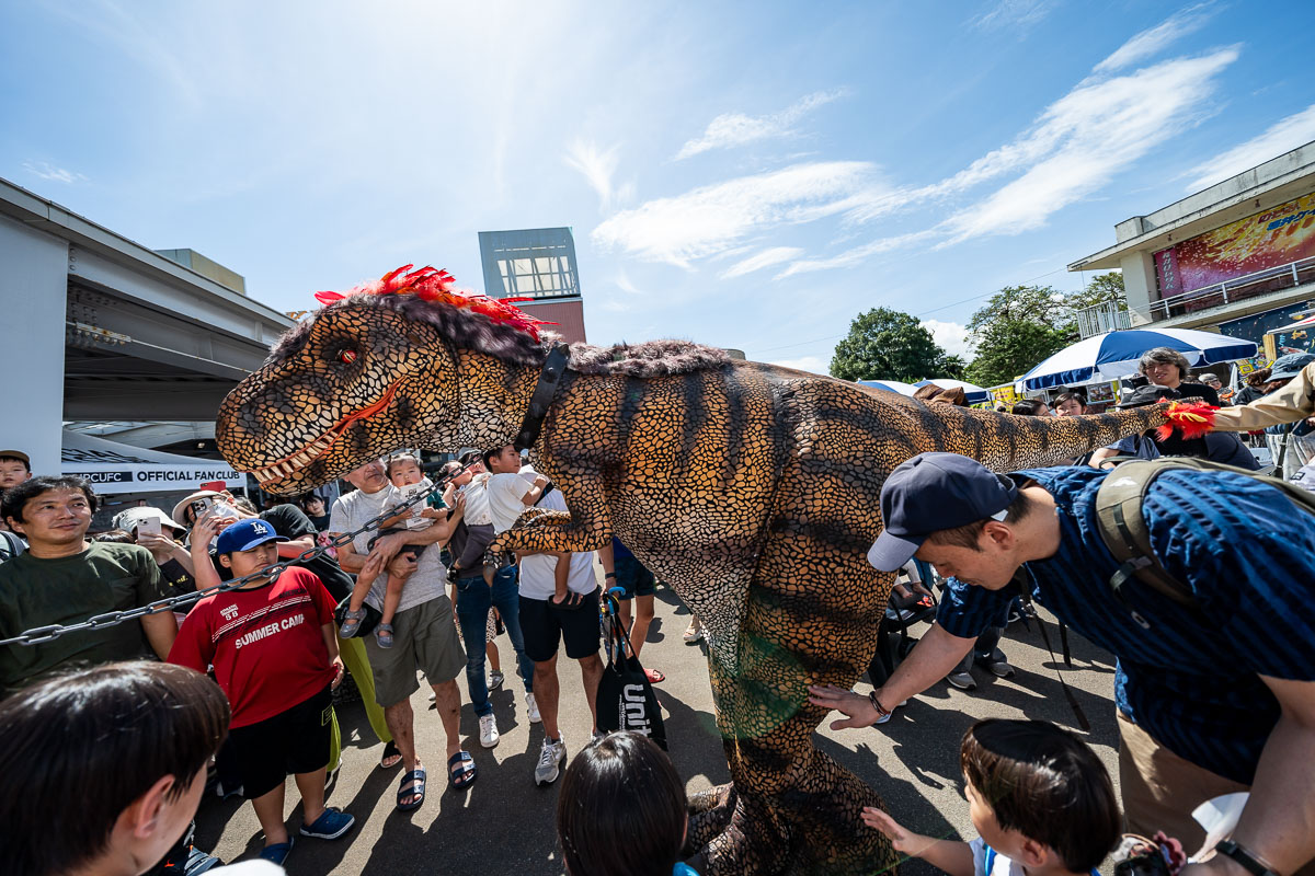 正門を入って右手の屋外ステージ横には、恐竜射的に恐竜輪投げ、レプリカを用いた化石発掘体験と、恐竜ブースが立ち並ぶ。決勝開催日の15日に至っては、なんと全長4mの恐竜までもが登場。場内を練り歩き、それに子供と親御さん達がはしゃぎながら追いかけると言う光景が繰り広げられた。恐竜パワー、まさに恐るべし。