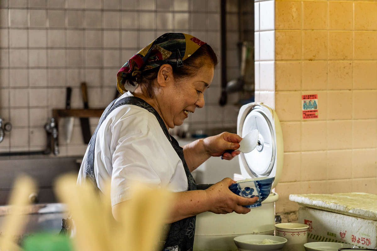 「もうすぐだからね」と言いながらご飯をよそう女将さん photo: Yuichiro Hosoda
