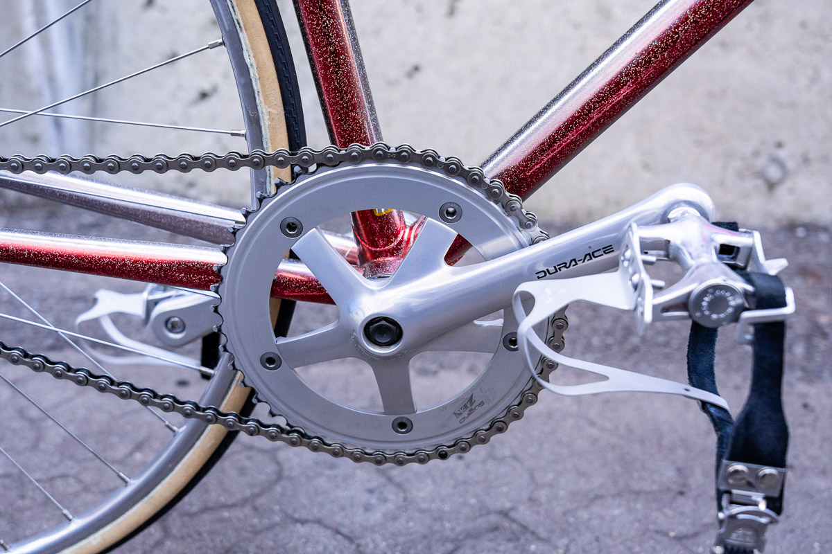 クランク長はスタンダードな165mmをチョイス。より大きなギアをかけていた頃は伸ばした事もあったそうだが、現時点の走りであれば、伸ばす必要はないと感じているようだ。