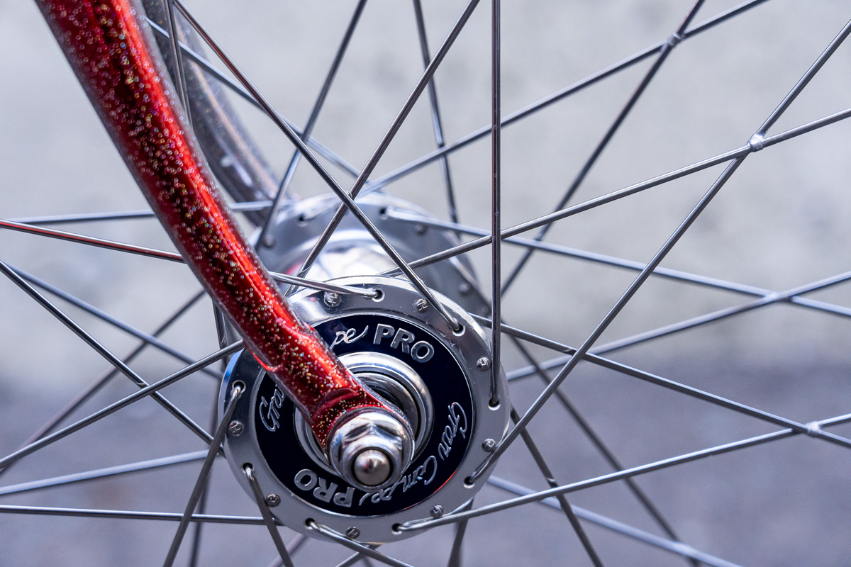 最後に注目したのはハブ。前がダイアコンペ グランコンペ プロ、後ろがシマノ デュラエースと前後変えてある。これも色々試した中で、「前はこれ、後ろはこれ」とより良い選択を行った結果と言う。「スポークテンションの硬さも車輪によって変えています。現状だとこれが一番自分に合っているなと言う感覚です」