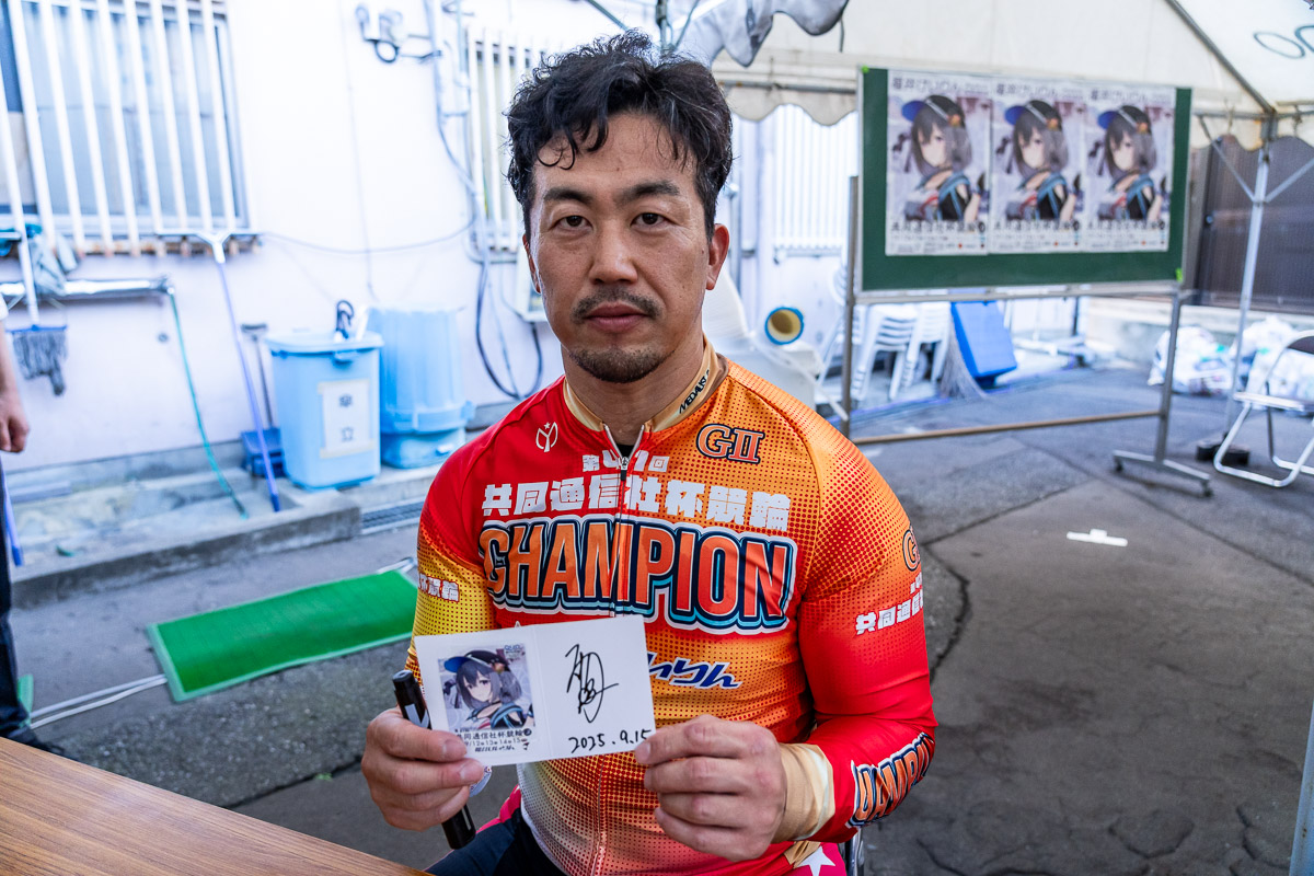 郡司選手は前日のS級選抜を1着で終えると、この日の第7レース・S級特選は、岩本俊介選手(千葉)、近藤保選手(千葉)と南関東ラインを組み、岩本選手1着、郡司選手2着とワンツーフィニッシュで当開催を締めくくった。そのレース直後で汗もまだ滴る中、郡司選手は爽やかな表情で質問にお答え下さった。ありがとうございました。