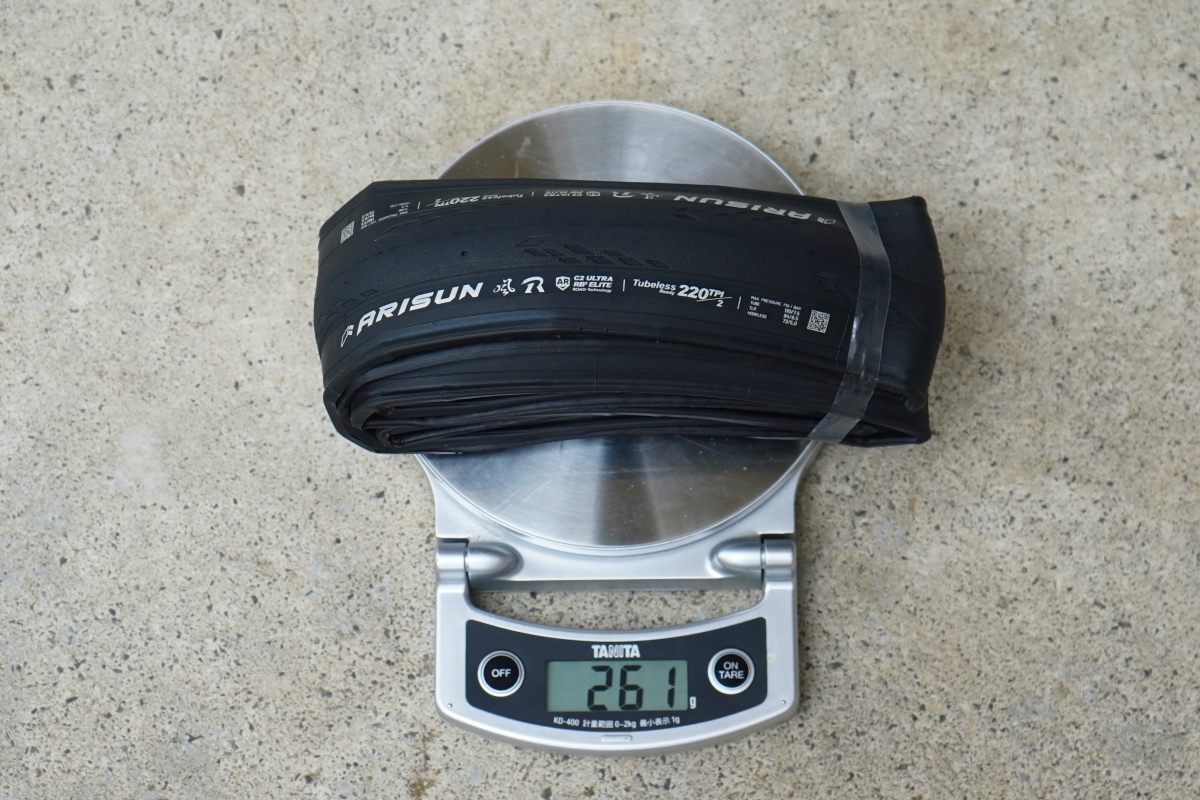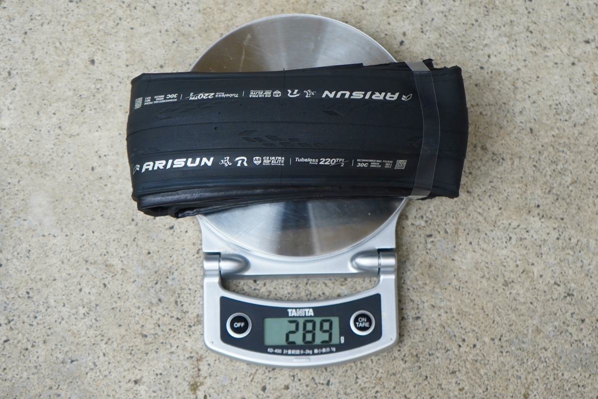 タイヤの重量はそれぞれ実測していくと、28Cで261g、30Cで289gとカタログスペックよりも5%ほど軽量に。ヒルクライムはもちろん、ロードレースでもクリテリウムで軽さは正義。そういったレースにおいてもアドバンテージを発揮してくれるだろう。