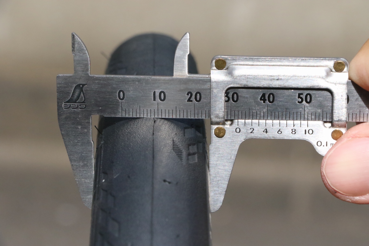 リム内幅が21mmのシマノDURA-ACE C50 TLにSTORM R1 TLRの700×28Cと30Cを取り付けていき、最大空気圧でのタイヤ幅を実測していく。ノギスで計測すると28Cでは30mm、30Cでは32mmとなった。