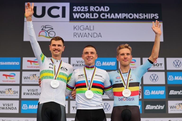 ロード世界選手権2025 男子エリートタイムトライアル表彰台:2位ヴァイン、1位エヴェネプール、3位ファンウィルデル photo:UCI