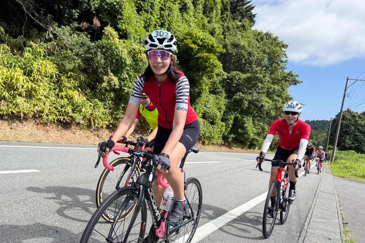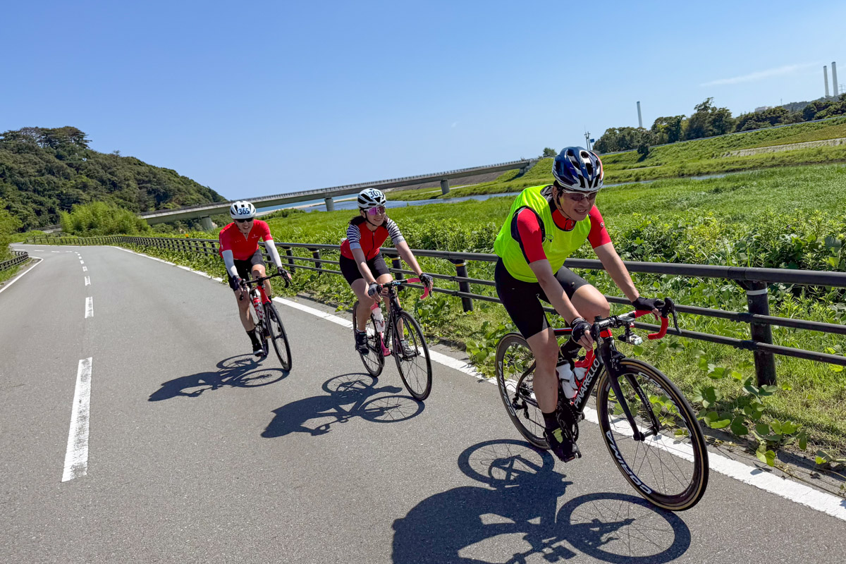 スタートは120kmコースを見送ってからの朝8時半。レースと同じ「天神岬スポーツ公園」から走り出す。大会ゲストライダーはモデル&サイクリストの日向涼子さんとユーチューバーの愛あむさんだ。