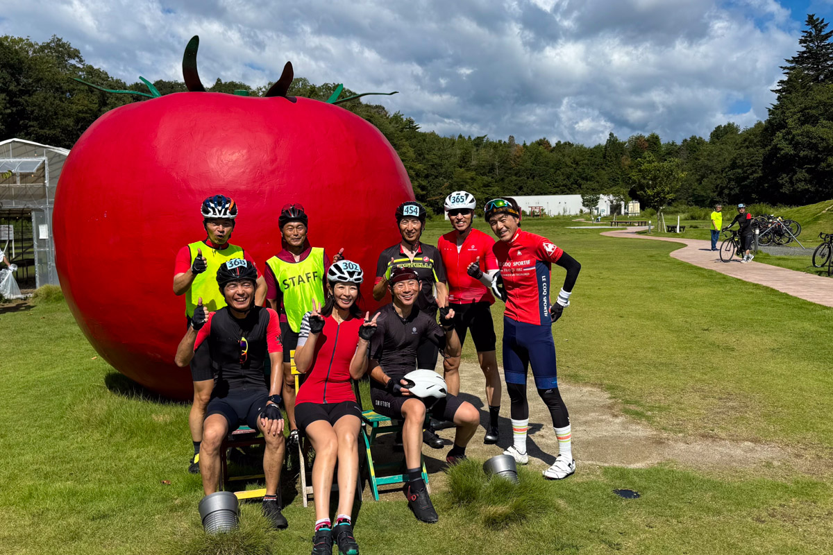 でっかいトマトのオブジェを見つけ、皆で記念撮影。エイドでは採れたてプチトマトや珍しいトマトのフライ(!)などを提供していただく。トマトの美味しさに感動して、夢中でパクパク食べてしまった。売店で無添加トマトジュースを買ってゴクゴク飲む人も。