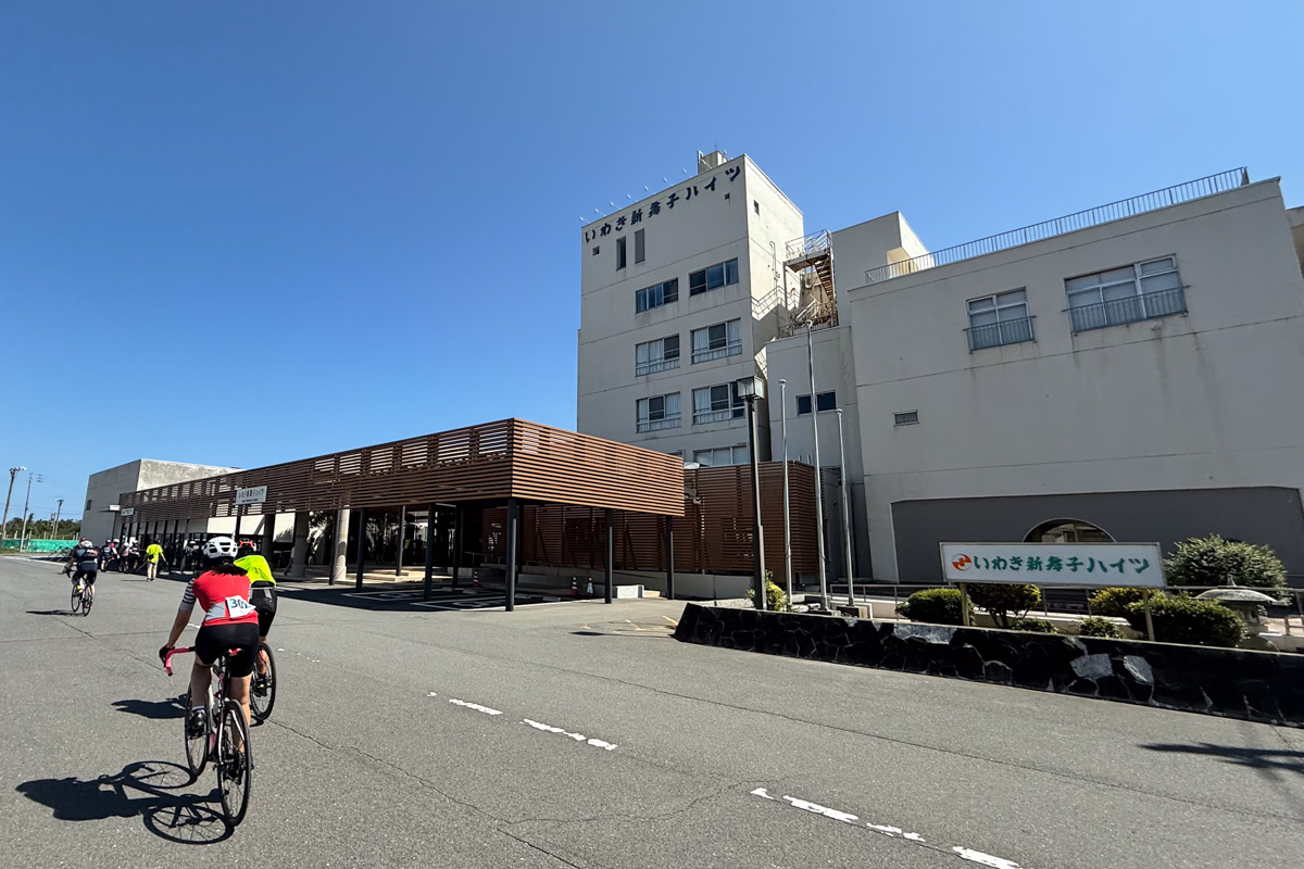 だんだんと海が近づいてきて、潮の香りが漂ってくる。次なるエイドはプール&温泉ホテルで有名な「いわき新舞子ハイツ」だ。ここはサイクルステーションとしてeBikeなど各種レンタサイクルも揃い、サイクルツーリングの拠点になる「自転車と泊まれる宿」としてオススメとのこと。