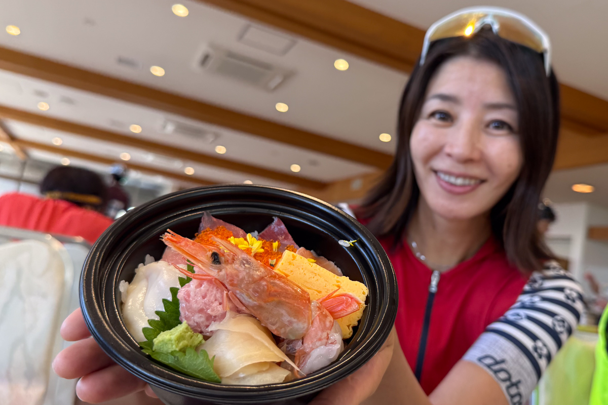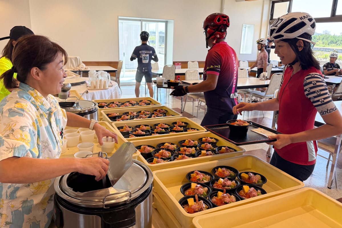そしてここで出されたエイド食は、なんと海鮮丼! しかも簡素なものでなく、ちゃんと豪華な海鮮丼が出るサイクリングイベントって! 驚きつつも、あおさの味噌汁と一緒に美味しくいただきました。やっぱり浜通りといえば海鮮が有名だけに、このおもてなしは嬉しい。