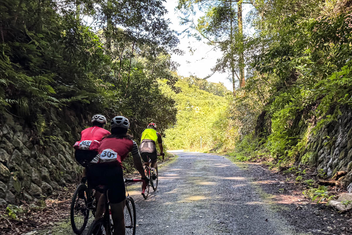 直線的で緩いアップダウンの道が続く。先導ライダーの牽きで適度なスピードを保ちながら走るが、真っ直ぐで単調な上り下りが繰り返す。勾配は緩やかでキツくはないので、淡々と走る。展望はあまり効かず、森のなかの緑深い道が続く。