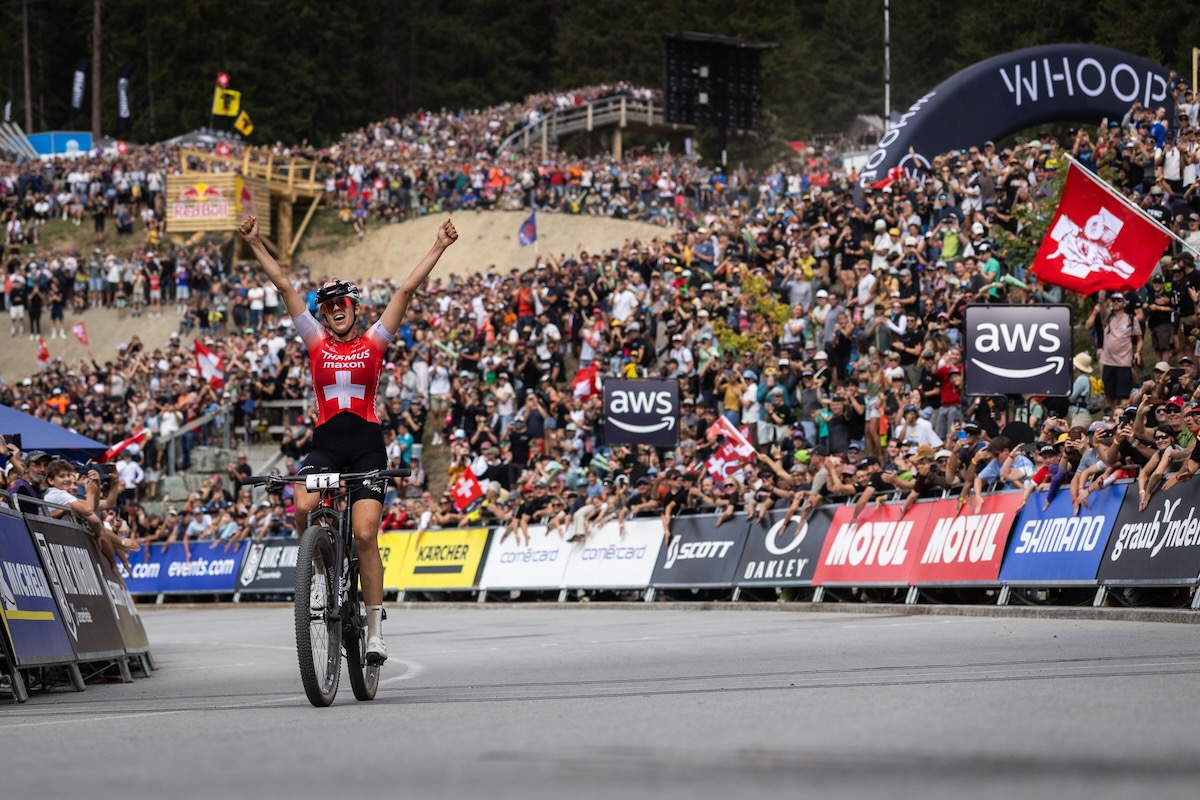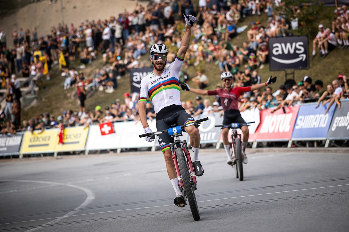 ジェニー・リスヴェッズ(キャニオン・CLLCTV XCO)がXCOの、アレッサンドラ・ケラー(スイス、トムス・マクソン)がXCC(ショートトラック)のアルカンシエル姿を披露したこの大会の注目は、なんといってもニノ・シューター(スイス)の引退レースであること。世界選手権10勝、ワールドカップ36勝、オリンピックメダル3度獲得という稀代の名選手のラストレースを見るべく、34回目のワールドカップ優勝、8回目の世界選手権制覇を果たしたレンツァーハイデには数万人のファンが詰めかけた。
