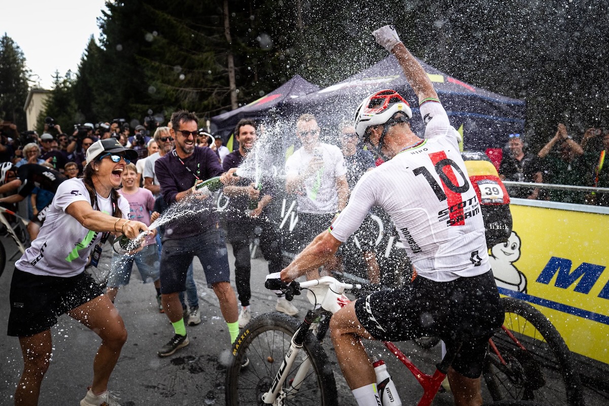 待ち構えていたチームスタッフに歓迎されるニノ・シューター(スイス、スコット・スラムMTBレーシングチーム) photo:UCI