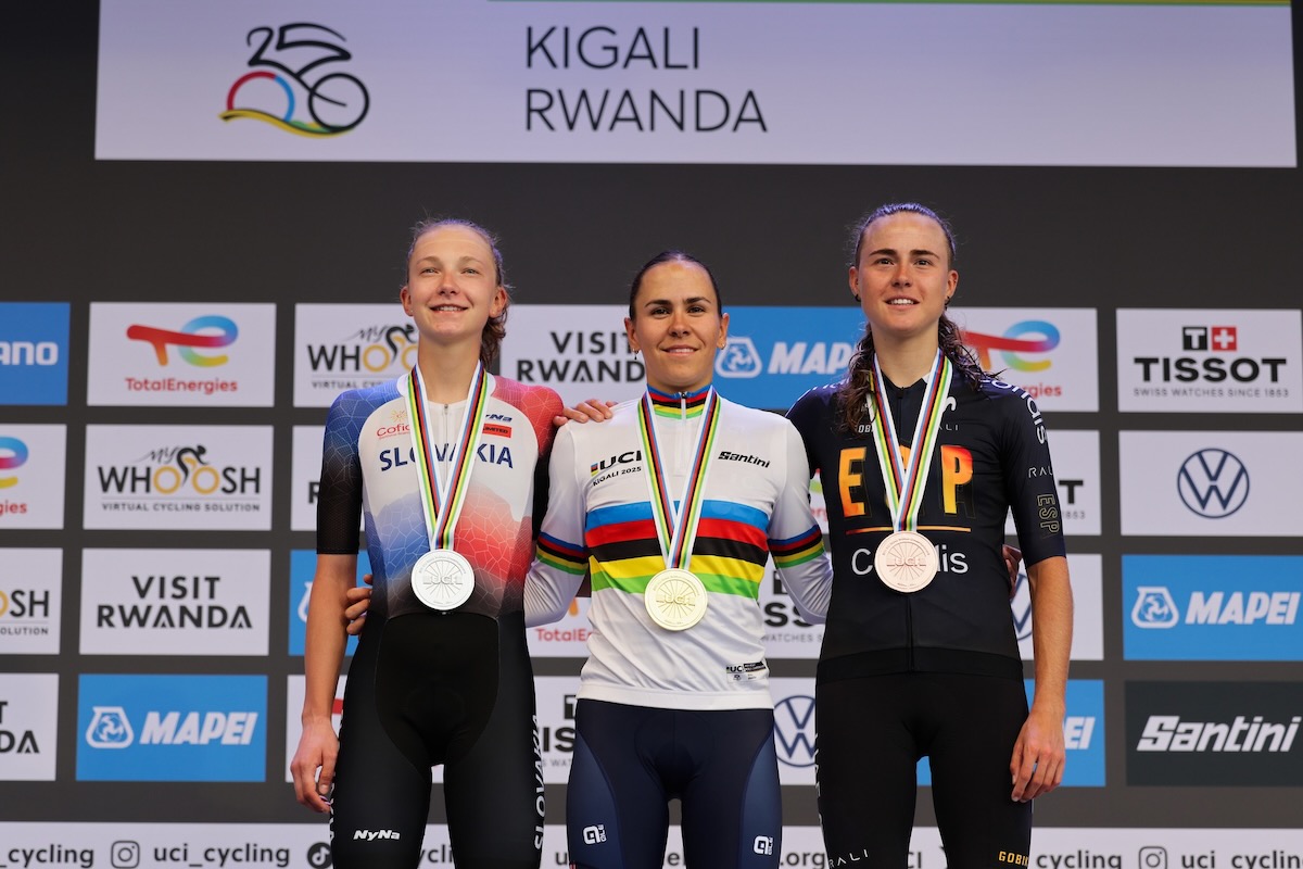 ロード世界選手権2025 女子U23ロードレース表彰台:2位ヴィクトリア・クラドノヴァ(スロバキア)、1位セリア・ジェリー(フランス)、3位パウラ・ブラシ(スペイン) photo:UCI