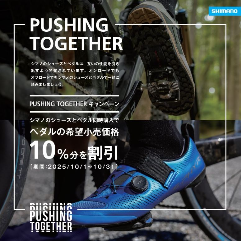 シマノが対象店舗でペダルとシューズを同時に購入すると10%OFFになるキャンペーン「PUSHING TOGETHER」を開催する。シマノのシューズとペダルをお得に購入できる機会だ。期間は10月1日~31日まで。以下、プレスリリースより紹介しよう。