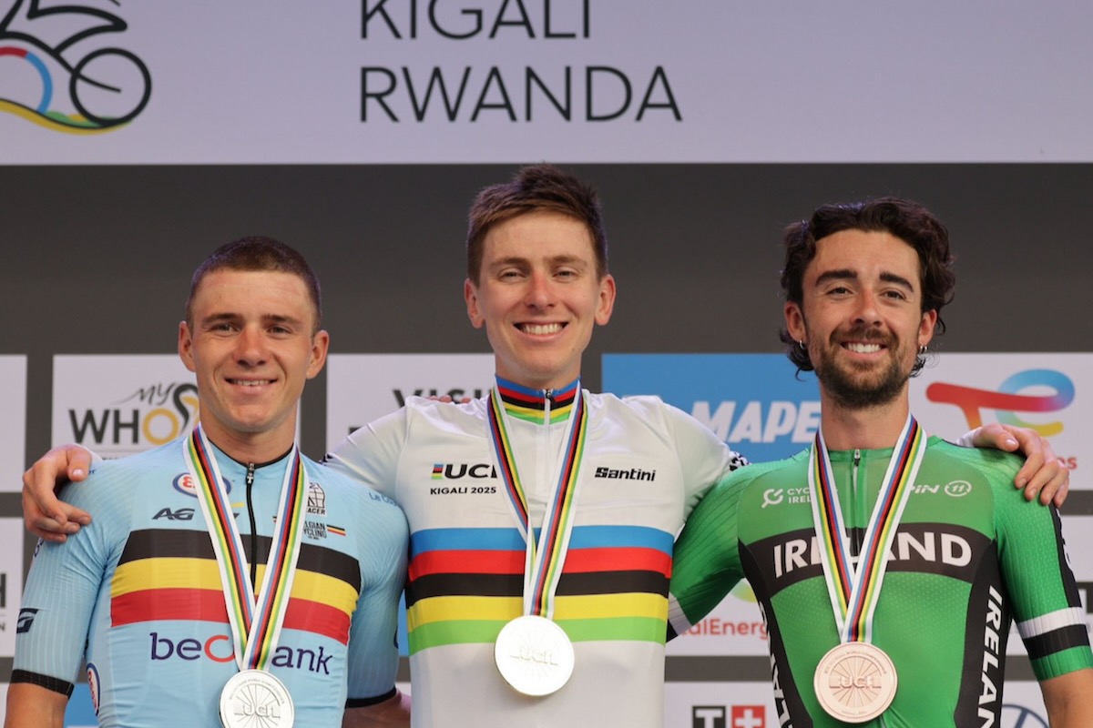 ロード世界選手権2025 男子エリートロードレース表彰台:2位エヴェネプール、1位ポガチャル、3位ヒーリー photo:UCI