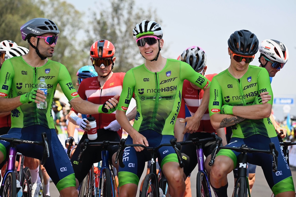 スロベニアチームと共に、集団先頭でスタートを待つタデイ・ポガチャル photo:CorVos