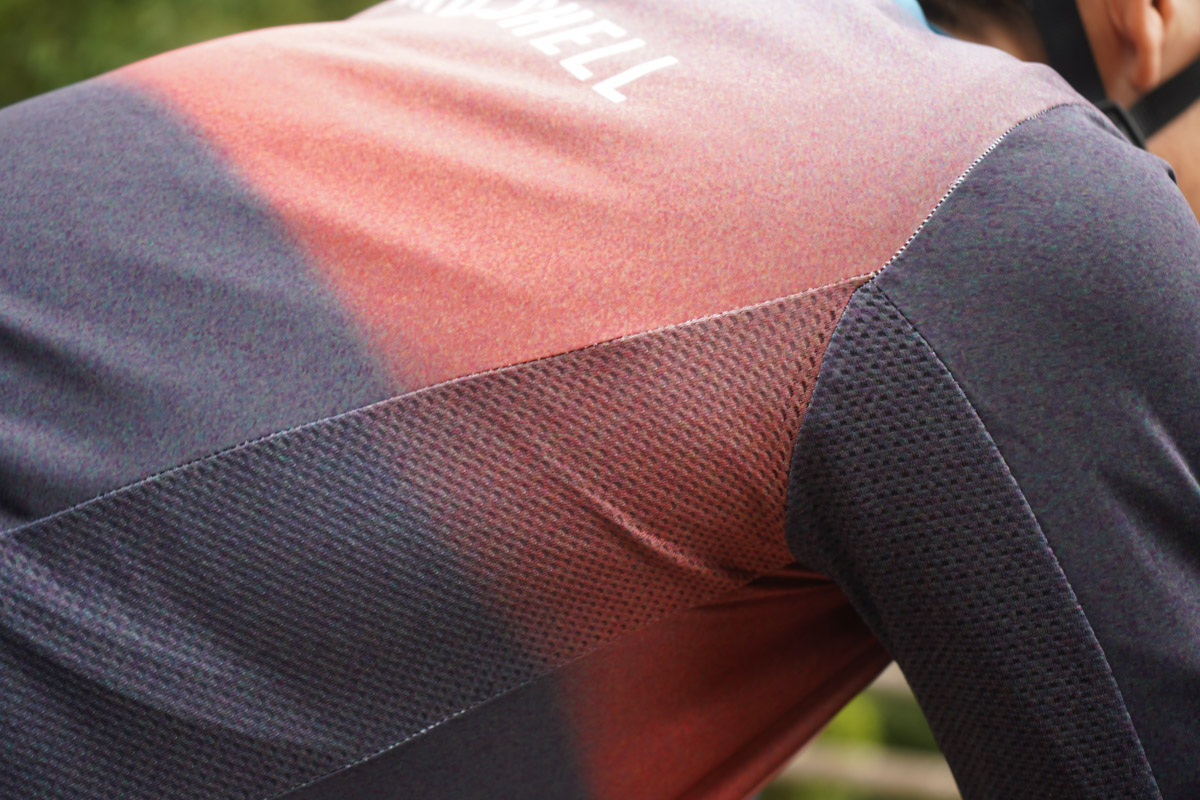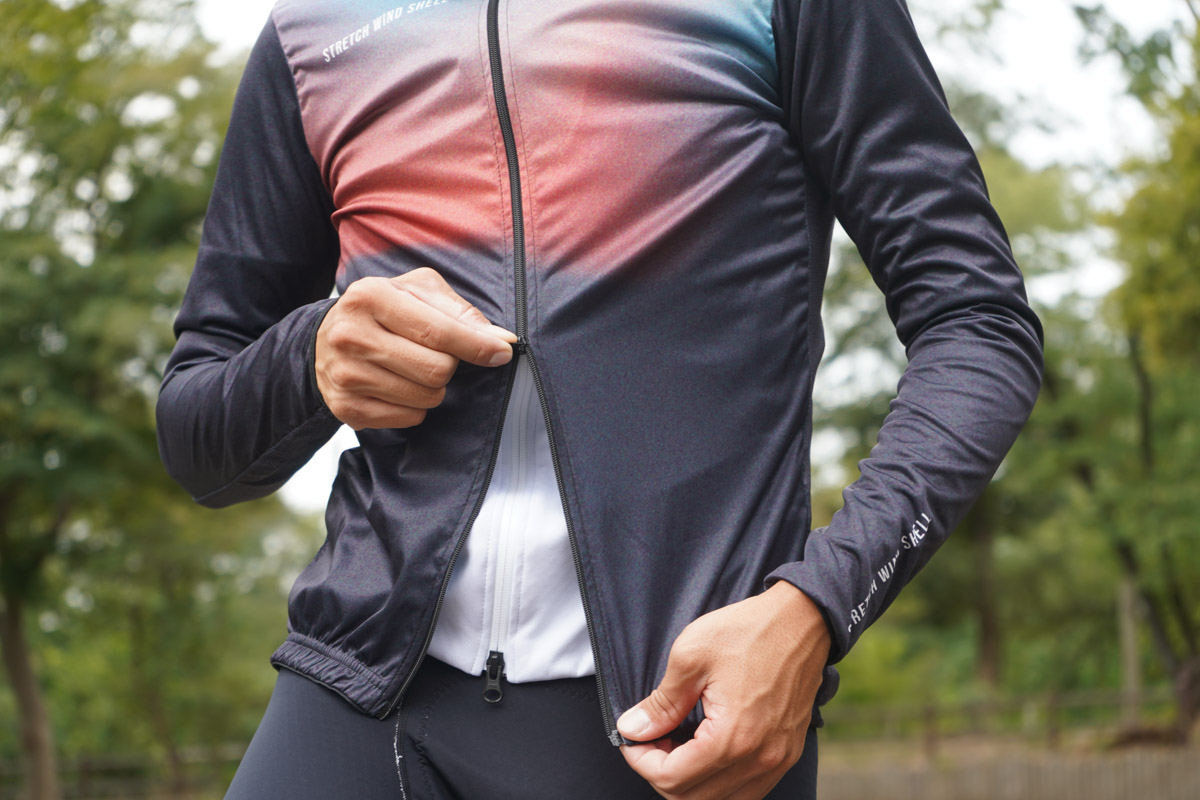 3分割のバックポケットも備えられており、ライド中の補給食やスマートフォンなどを収納できるのは嬉しい。ファスナーは上下どちらからでも開けられる仕様となっており、体温調節が容易だ。ヒルクライム中に暑くなってきたら下から開けて熱を逃がし、ダウンヒルで冷え込んできたら閉じて保温する、といった細かな調整がスムーズに行える。